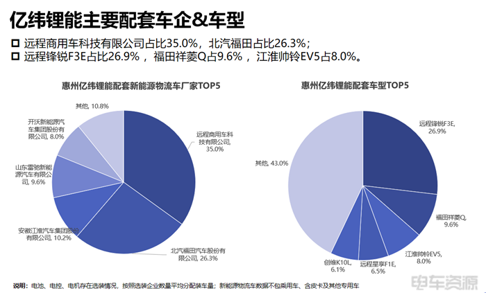 亿纬锂能则不同于宁德时代,最鲜明的特征是主要配套微小卡车型。从企业来看,远程新能源商用车和福田汽车贡献了超6成电池装车量;从车型来看,远程锋锐F3E、福田祥菱Q、江淮帅铃EV5三款车贡献了超4成动力电池装车量。
