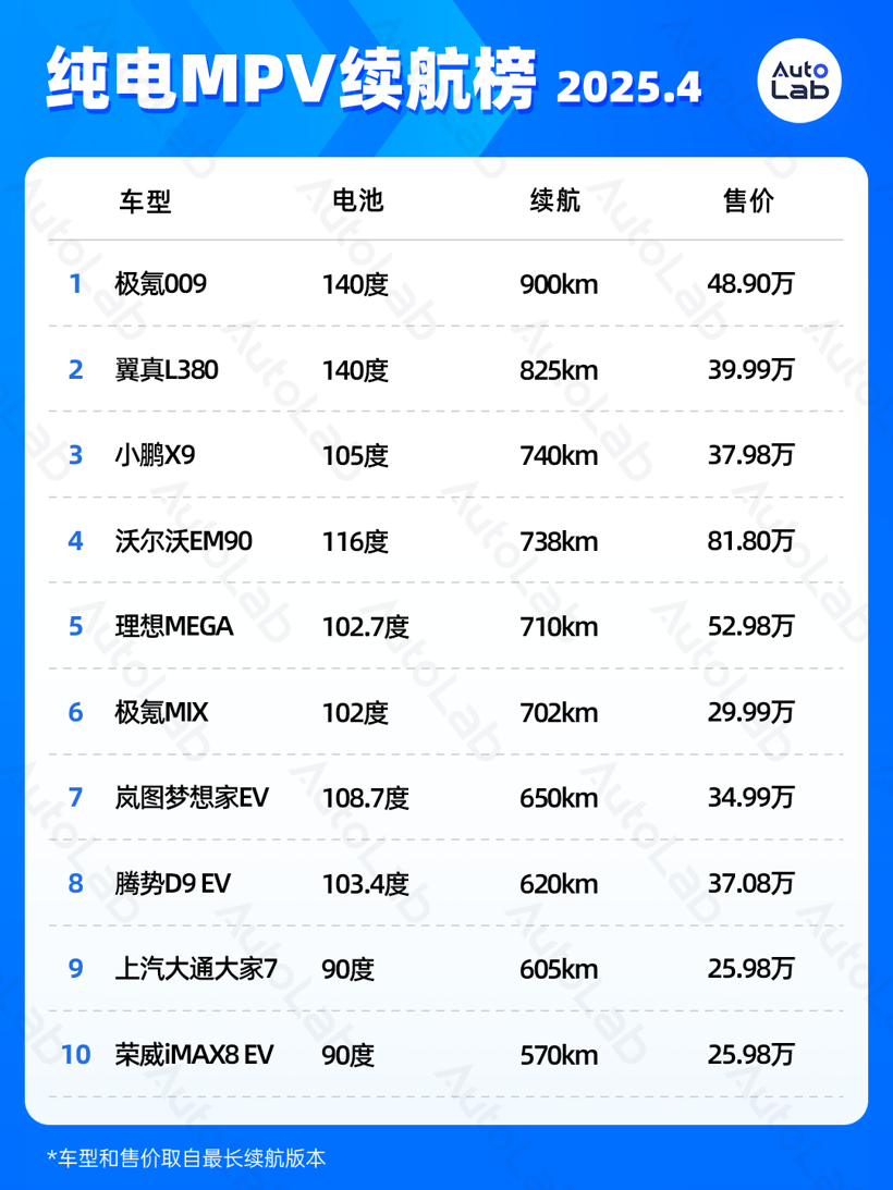 纯电MPV续航榜
