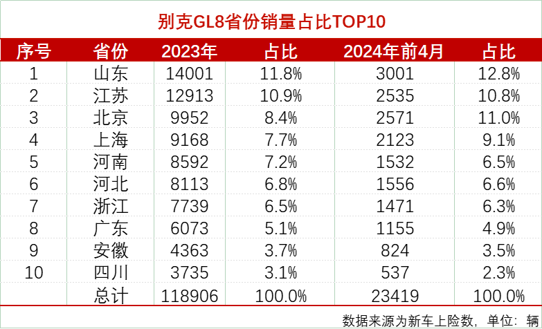 而从GL8全国销售区域来看,山东、江苏、北京、上海等沿海省份是别克GL8的销售大省,前5大省份基本上占据了GL8一半的销量贡献。但根据2023年和今年前4个月的上险数显示,被一众MPV竞争和挤压的别克GL8,几乎被赶向了山东、北京、上海这三大省市,而其余的省份销量占比无一例外均在下降。
