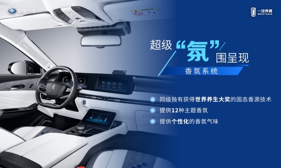 在车内气氛的营造上,奔腾E01搭载了智能香氛系统和氛围灯系统,采用获得世界养生大奖的固态香源技术,提供12种主题香氛,采用檀香、佛手柑、艾草等中药主材,给车主带来丰富嗅觉体验。通过面部识别和提示点选,还可以提供个性化的香氛与灯光模式,带来了高端豪华汽车才能享有的奢华氛围。