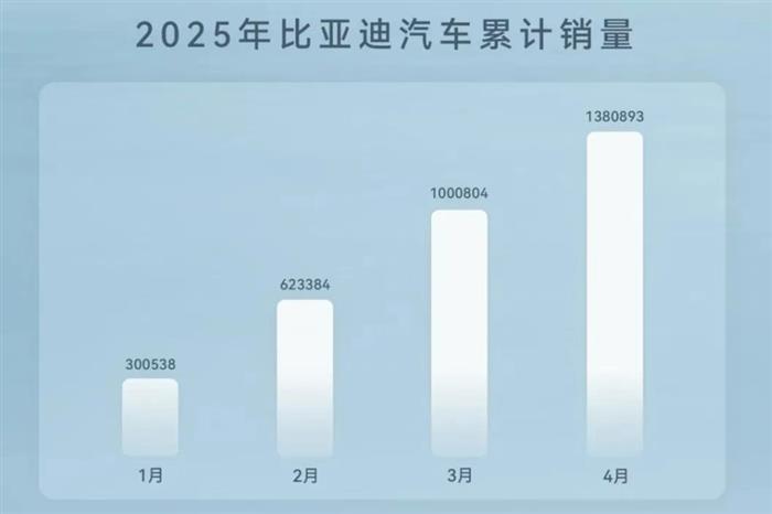 今年1-4月,比亚迪累计销量为138.09万辆,同比增长46.98%。