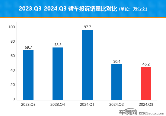 据国内领先的缺陷汽车产品信息收集平台车质网数据显示,2024年三季度共受理国内轿车有效投诉23,967宗。同期,乘联会数据显示国内轿车(除进口车)销量约为264万辆,涵盖209款车型。为确保数据的准确性,车质网本次只统计这209款车型的首次投诉案例,计算得出2024年三季度轿车投诉销量比均值为万分之46.2,高于同期所有车型均值,整体表现仍处于落后地位。不过,与二季度轿车万分之50.4的均值相比略有降低,季度投诉销量比表现有向好趋势。